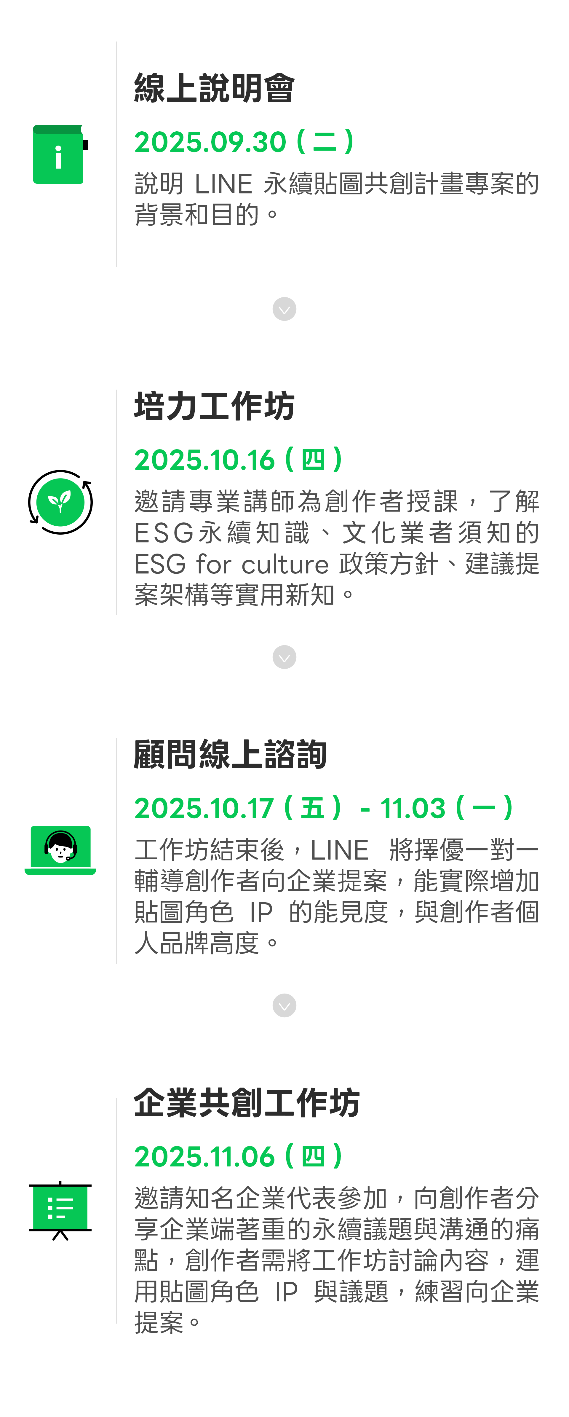 此計畫為邀請制,創作者將參與兩場工作坊,工作坊結束後,LINE 將擇優輔導創作者並向企業提案。完整參與者可以獲得結訓證明書,自身的貼圖角色 IP 也將於 LINE 永續貼圖共創計劃官網與 LINE 官方部落格獲得曝光推薦,能增加貼圖角色 IP 的能見度,與創作者個人品牌高度。